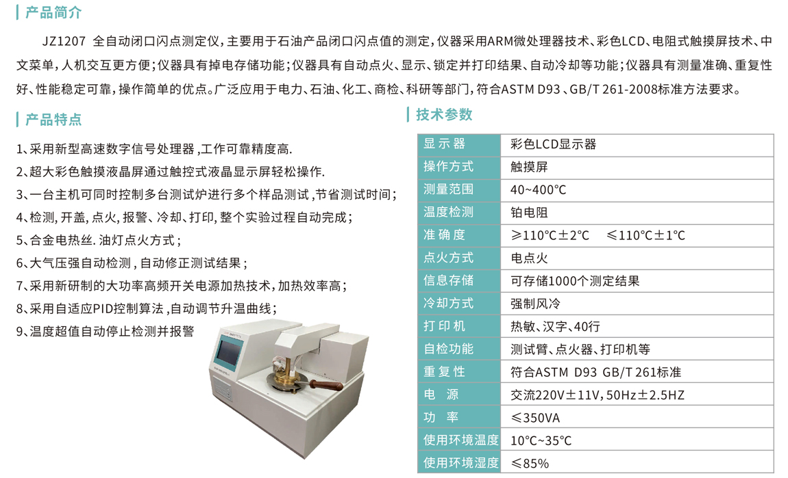 JZ1207全自動閉口閃點測定儀,主要用于石油產(chǎn)品閉口閃點值的測定,儀器采用ARM微處理器技術(shù)、彩色LCD、電阻式觸摸屏技術(shù)、中 文菜單,人機交互更方便;儀器具有掉電存儲功能;儀器具有自動點火、顯示、鎖定并打印結(jié)果、自動冷卻等功能;儀器具有測量準確、重復(fù)性 好、性能穩(wěn)定可靠,操作簡單的優(yōu)點。廣泛應(yīng)用于電力、石油、化工、商檢、科研等部門,符合ASTM D93、GB/T261-2008標準方法要求。