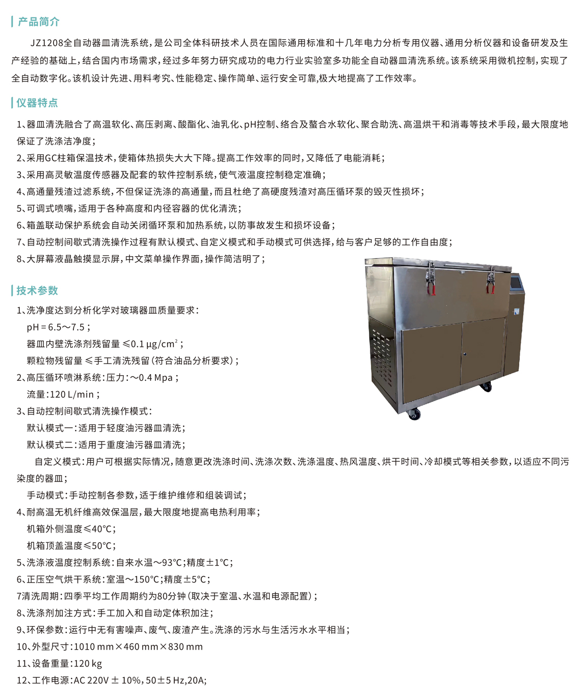 JZ1208全自動(dòng)器皿清洗系統(tǒng),是公司全體科研技術(shù)人員在國(guó)際通用標(biāo)準(zhǔn)和十幾年電力分析專(zhuān)用儀器、通用分析儀器和設(shè)備研發(fā)及生 產(chǎn)經(jīng)驗(yàn)的基礎(chǔ)上,結(jié)合國(guó)內(nèi)市場(chǎng)需求,經(jīng)過(guò)多年努力研究成功的電力行業(yè)實(shí)驗(yàn)室多功能全自動(dòng)器皿清洗系統(tǒng)。該系統(tǒng)采用微機(jī)控制,實(shí)現(xiàn)了 全自動(dòng)數(shù)字化。該機(jī)設(shè)計(jì)先進(jìn)、用料考究、性能穩(wěn)定、操作簡(jiǎn)單、運(yùn)行安全可靠,極大地提高了工作效率。
