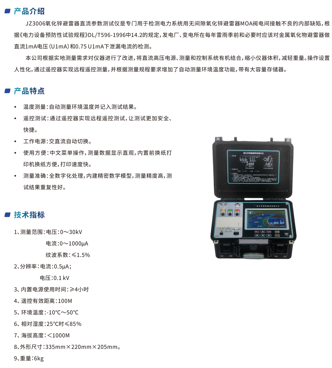JZ3006氧化鋅避雷器直流參數測試儀是專門用于檢測電力系統用無間隙氧化鋅避雷器MOA閥電間接觸不良的內部缺陷,根 據《電力設備預防性試驗規程》DL/T596-1996中14.2的規定,發電廠、變電所在每年雷雨季前和必要時應該對金屬氧化物避雷器做 直流1mA電壓(U1mA)和0.75U1mA下泄漏電流的檢測。