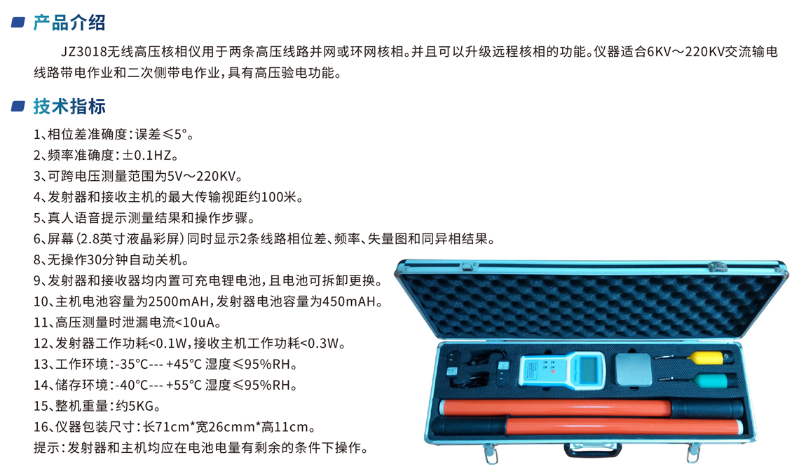 JZ3018無線高壓核相儀用于兩條高壓線路并網或環網核相。并且可以升級遠程核相的功能。儀器適合6KV~220KV交流輸電 線路帶電作業和二次側帶電作業,具有高壓驗電功能。