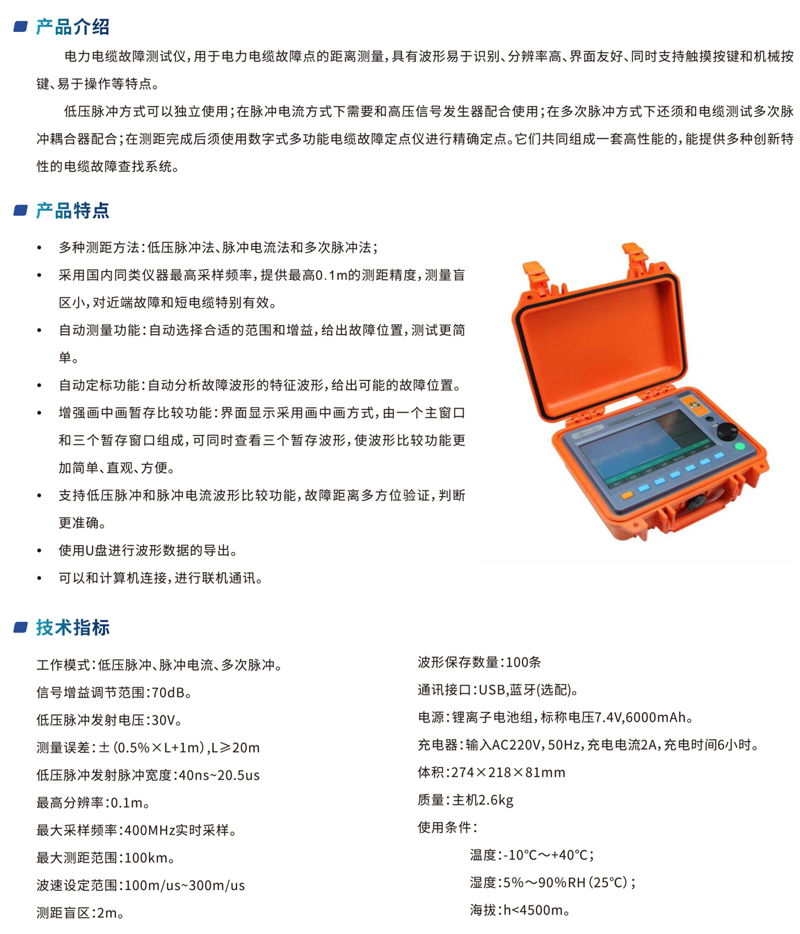 電力電纜故障測(cè)試儀,用于電力電纜故障點(diǎn)的距離測(cè)量,具有波形易于識(shí)別、分辨率高、界面友好、同時(shí)支持觸摸按鍵和機(jī)械按 鍵、易于操作等特點(diǎn)。