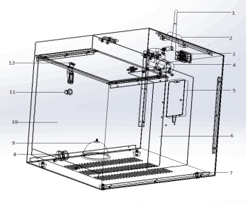 凈化系統(tǒng)組成部件:1、改進(jìn)后433M無線通訊模塊;2、把手、3、電源插口;4、空氣泵;5、電源模塊;6、吸附劑氣室;7、萬向輪;8、排水口;9、氣泡石;10、316不銹鋼內(nèi)膽;11、排氣口;12、注水口