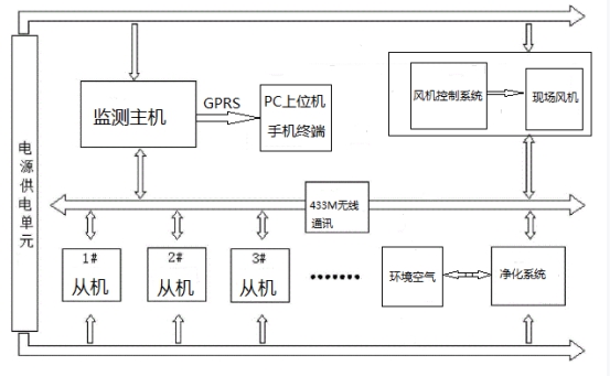 本發(fā)明針對現(xiàn)有技術(shù)的不足,設(shè)計了一種基于GPRS技術(shù)、改進(jìn)后的433M無線數(shù)傳技術(shù)和智能傳感器技術(shù)相結(jié)合的多功能環(huán)境遠(yuǎn)程監(jiān)測凈化系統(tǒng),它不僅能同時對多個監(jiān)測點進(jìn)行多種環(huán)境氣體數(shù)據(jù)采集、環(huán)境溫濕度進(jìn)行監(jiān)測、就地風(fēng)機(jī)控制、空氣環(huán)境凈化等功能,而且能夠基于改進(jìn)后433M無線通信協(xié)議將各個從機(jī)采集的數(shù)據(jù)匯聚到主機(jī),主機(jī)則通過GPRS網(wǎng)絡(luò)將數(shù)據(jù)傳輸?shù)竭h(yuǎn)程服務(wù)器,用戶可通過電腦或者手機(jī)上網(wǎng)實時查看環(huán)境空氣數(shù)據(jù)以及現(xiàn)場查看監(jiān)測系統(tǒng)工作狀態(tài)。